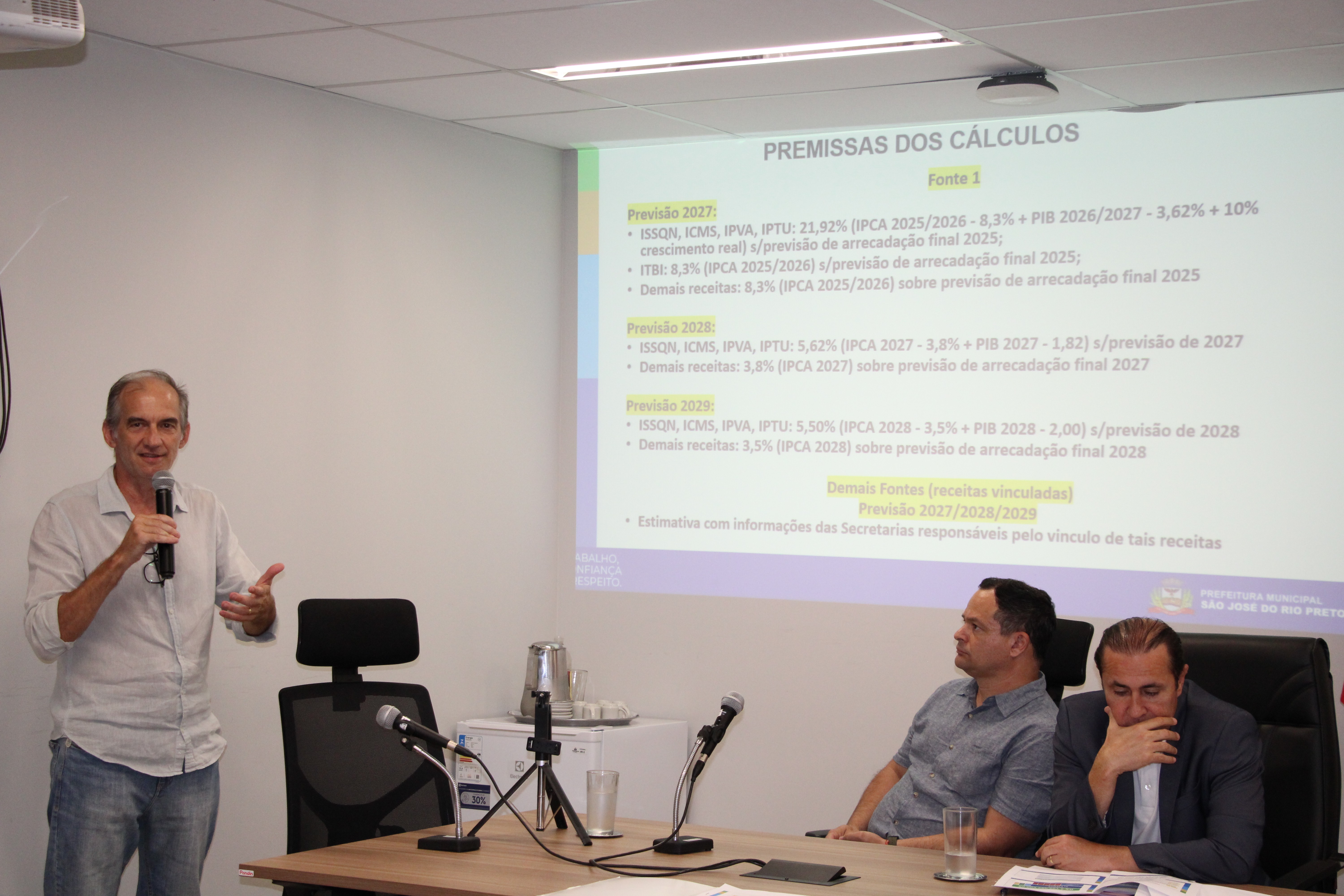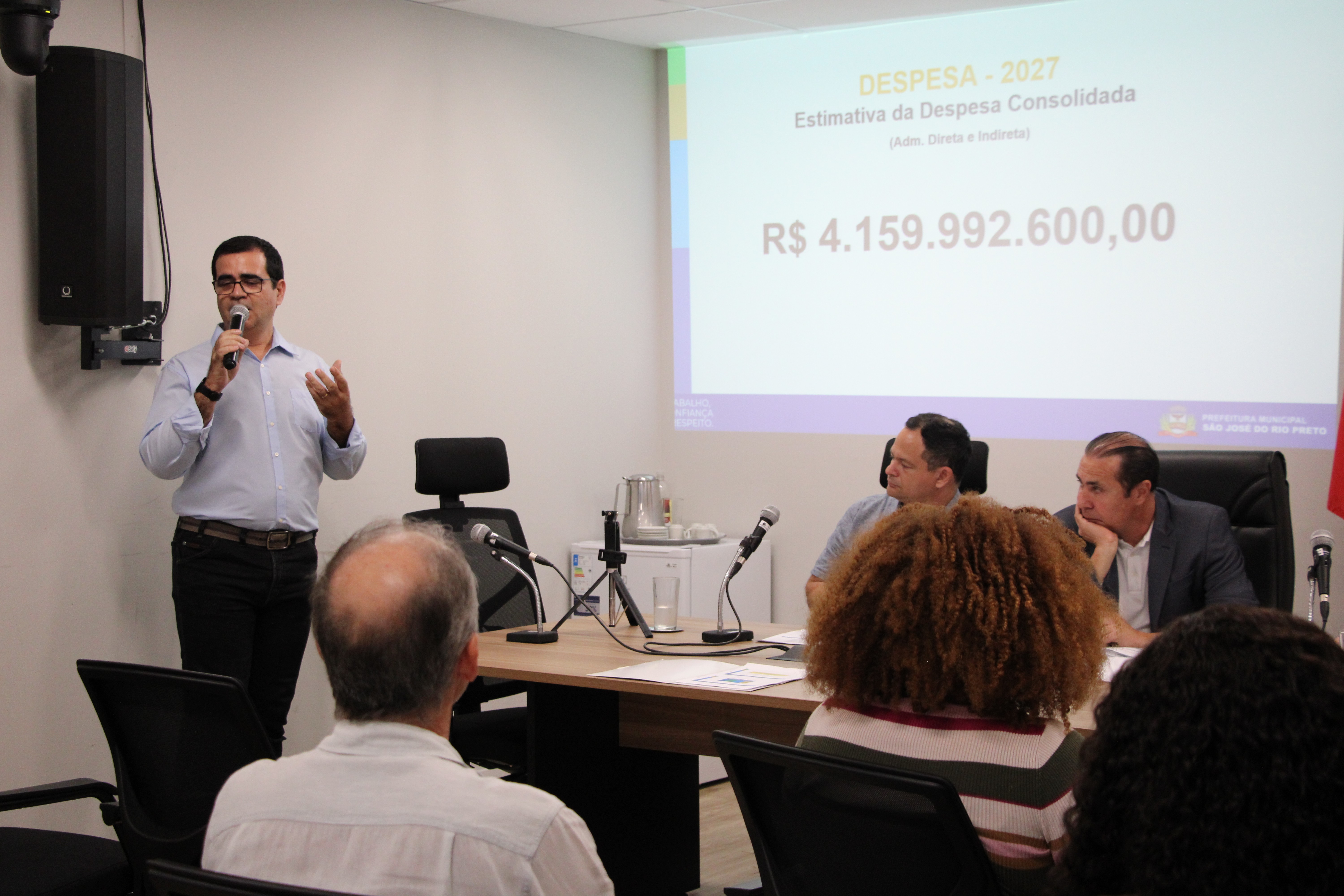 Foi apresentada a previsão da receita líquida consolidada da administração direta e indireta, totalizando R$ 4.159.992.600,00. A distribuição da previsão da receita é a seguinte: Prefeitura Municipal (R$3,1 bilhões), SeMae (R$ 596,8 milhões), EMCOP (R$ 3,4 milhões) e Riopretoprev (R$ 450,4 milhões).
